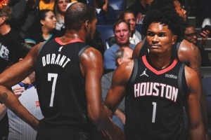 本场比赛,杜兰特全场出战34分半,18投5中,拿到11分4板5助1断1帽,正负值+20;阿门打了38分钟26投13中,三分3中1、罚球1中1拿到28分10篮板7助攻2抢断,正负值+22。