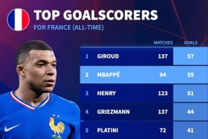 体育资讯11月14日讯 世预赛欧洲区比赛,姆巴佩梅开二度,法国主场4-0击败乌克兰。姆巴佩为法国队攻入55球,差2球追平队史射手王吉鲁。