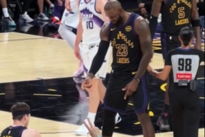 小詹也来啦!布朗尼披挂上阵三分张手就有 詹姆斯场下开心庆祝