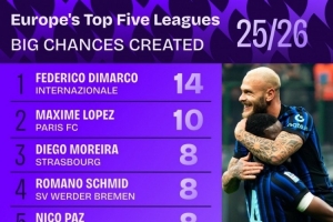 体育资讯11月21日讯 Squawka统计了本赛季球员在五大联赛创造重大机会的次数,并列出榜单,迪马尔科创造14次重大机会最多。