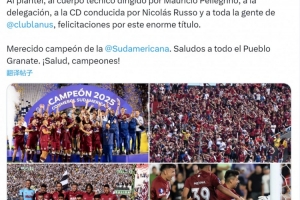 阿根廷足协主席塔皮亚社媒写道:“我谨向拉努斯全队、毛里西奥·佩莱格里诺率领的教练组、随行代表团、尼古拉斯·鲁索领导的俱乐部董事会,以及所有拉努斯的球迷们表示祝贺,祝贺你们获得这项重要的冠军!