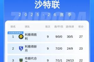 积分榜上,胜利目前全胜的同时4分领跑,利雅得新月不败排在第2,卫冕冠军吉达联合仅排名第7。