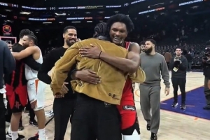 GIF-火箭&太阳赛后双方球员叙旧拥抱