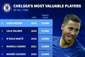 切尔西队史球员最高身价排行榜: